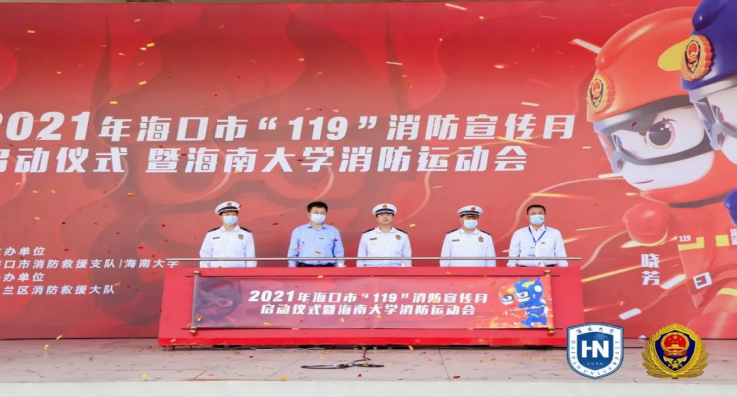 启动仪式上海口市消防救援支队支队长汤坚等与会领导揭幕海口消防IP卡通形象,共同启动“119”消防宣传月暨必一运动官方网站消防运动会活动。